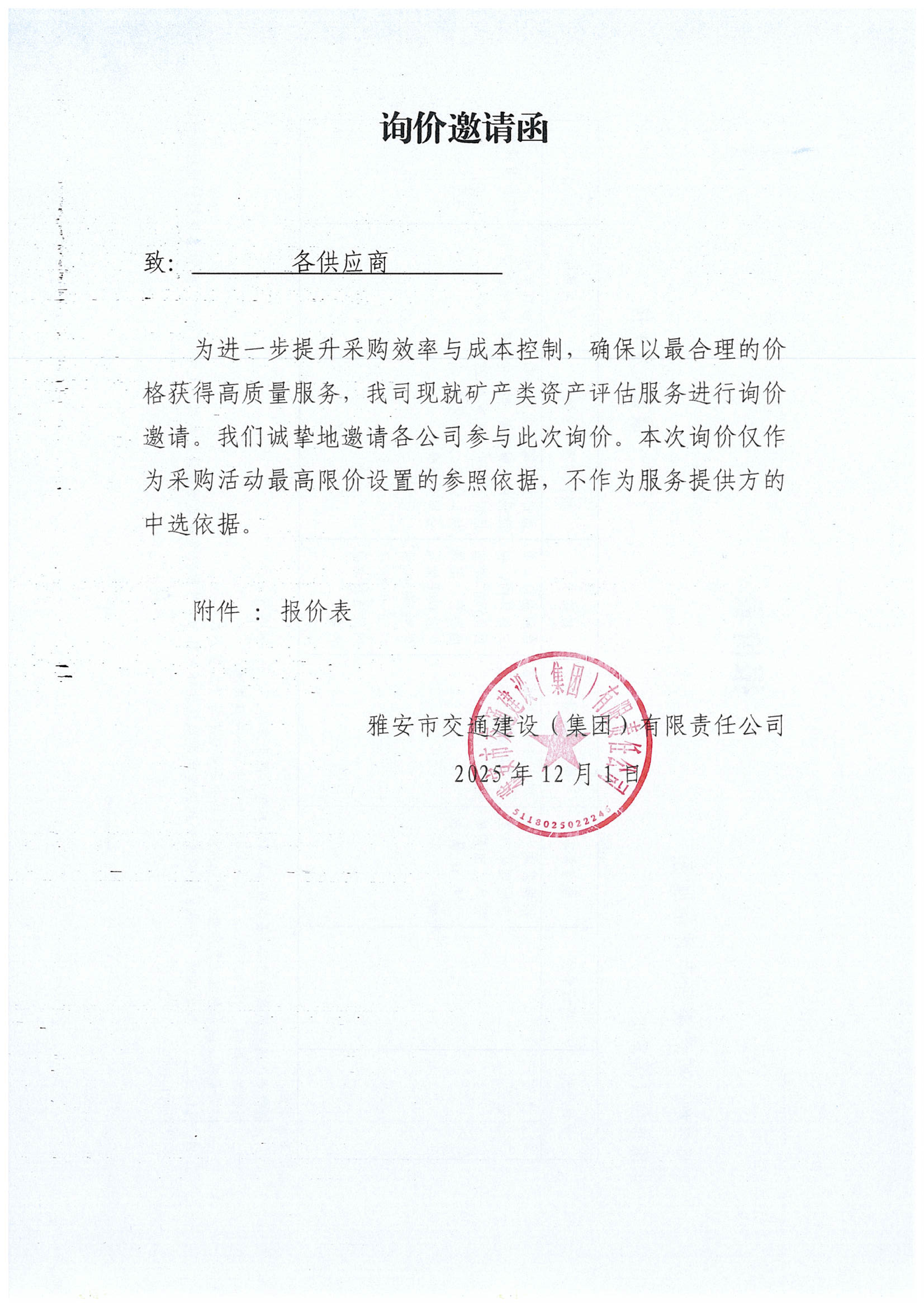 關(guān)于雅安市交通建設(shè)(集團(tuán))有限責(zé)任公司礦產(chǎn)類資產(chǎn)評估服務(wù)采購限價的詢價函