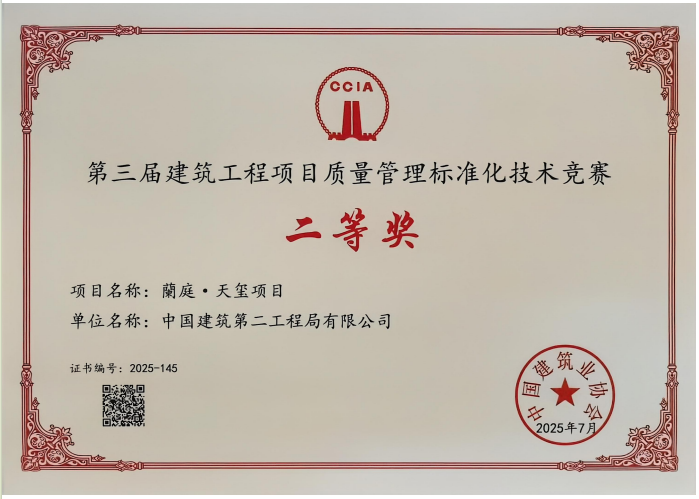 近日,交建開發(fā)公司旗下“蘭庭・天璽”項目在中國建筑業(yè)協(xié)會組織的“第三屆建筑工程項目質量管理標準化技術競賽”中榮獲二等獎。此次獲獎,標志著“蘭庭・天璽”項目的質量管理體系與工程實體質量獲得了行業(yè)權威認可,為項目后續(xù)創(chuàng)建更高層次的品質獎項積累了寶貴經驗。