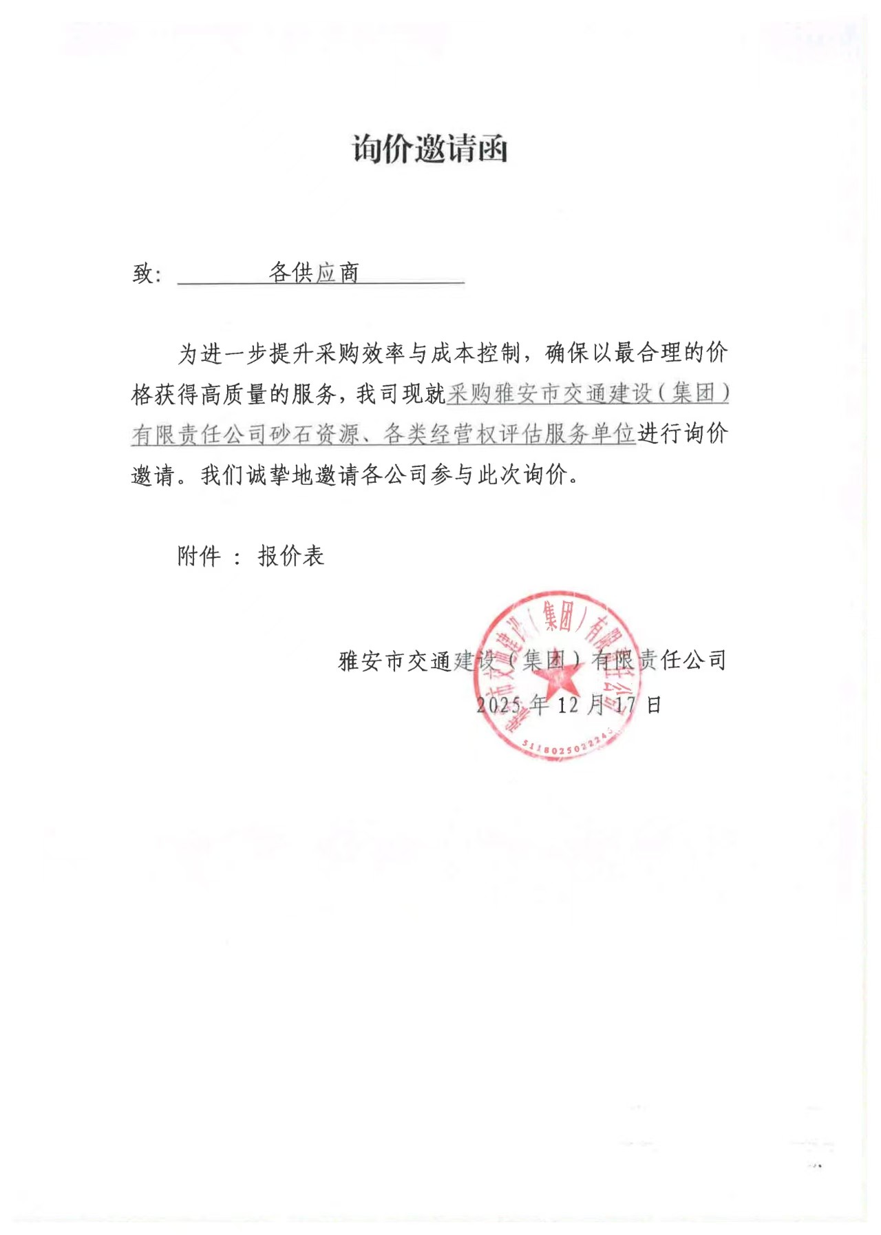 關(guān)于雅安市交通建設(shè)(集團(tuán))有限責(zé)任公司砂石資源、各類經(jīng)營(yíng)權(quán)評(píng)估服務(wù)限價(jià)的詢價(jià)函