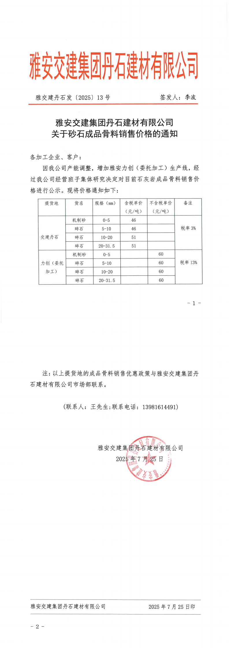 雅安交建集團丹石建材有限公司關于調整砂石成品骨料價格的通知(2025.7.28)